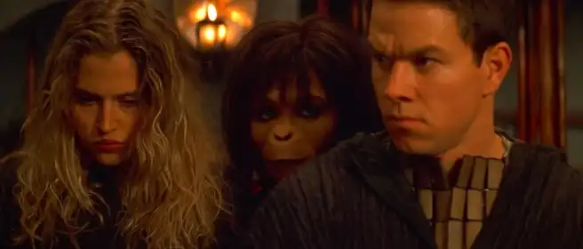 «Планета обезьян» (2001, реж. Тим Бёртон) — это переработанная версия классической истории о космическом путешественнике Лео Дэвидсоне (Марка Уолберга), который попадает в мир, где разумные обезьяны правят, а люди — низший вид. Лео пытается выжить, найти путь домой и раскрыть правду о происхождении нового порядка; фильм сочетает приключение, драму и тему столкновения цивилизаций. Финал фильма предлагает неожиданную, спорную развязку с элементом временной/альтернативной петли.